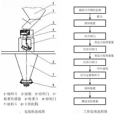 該顆粒包裝機(jī)由機(jī)架、給料器、稱(chēng)料斗和電氣箱四部分組成。在對(duì)塑料顆粒、糧食、種子、炒貨、飼料等顆粒包裝工作開(kāi)始時(shí),本顆粒定量包裝機(jī)兩臺(tái)給料器同時(shí)對(duì)稱(chēng)料斗喂料,喂料過(guò)程由控制儀表通過(guò)對(duì)傳感器輸出信號(hào)連續(xù)采樣,并隨時(shí)與大投值比較,當(dāng)料重不小于大投值時(shí),自動(dòng)停止大投給料器,剩下一臺(tái)小投給料器繼續(xù)細(xì)喂料,并與目標(biāo)值比較,當(dāng)料重接近目標(biāo)值時(shí)(稱(chēng)重值=目標(biāo)值-落差值),停止喂料,等待操作者套袋,有套袋操作時(shí),感應(yīng)開(kāi)關(guān)向儀表送出開(kāi)關(guān)信號(hào),塑料顆粒包裝機(jī)卸料,無(wú)套袋操作時(shí)機(jī)器等待,直至套袋卸料。